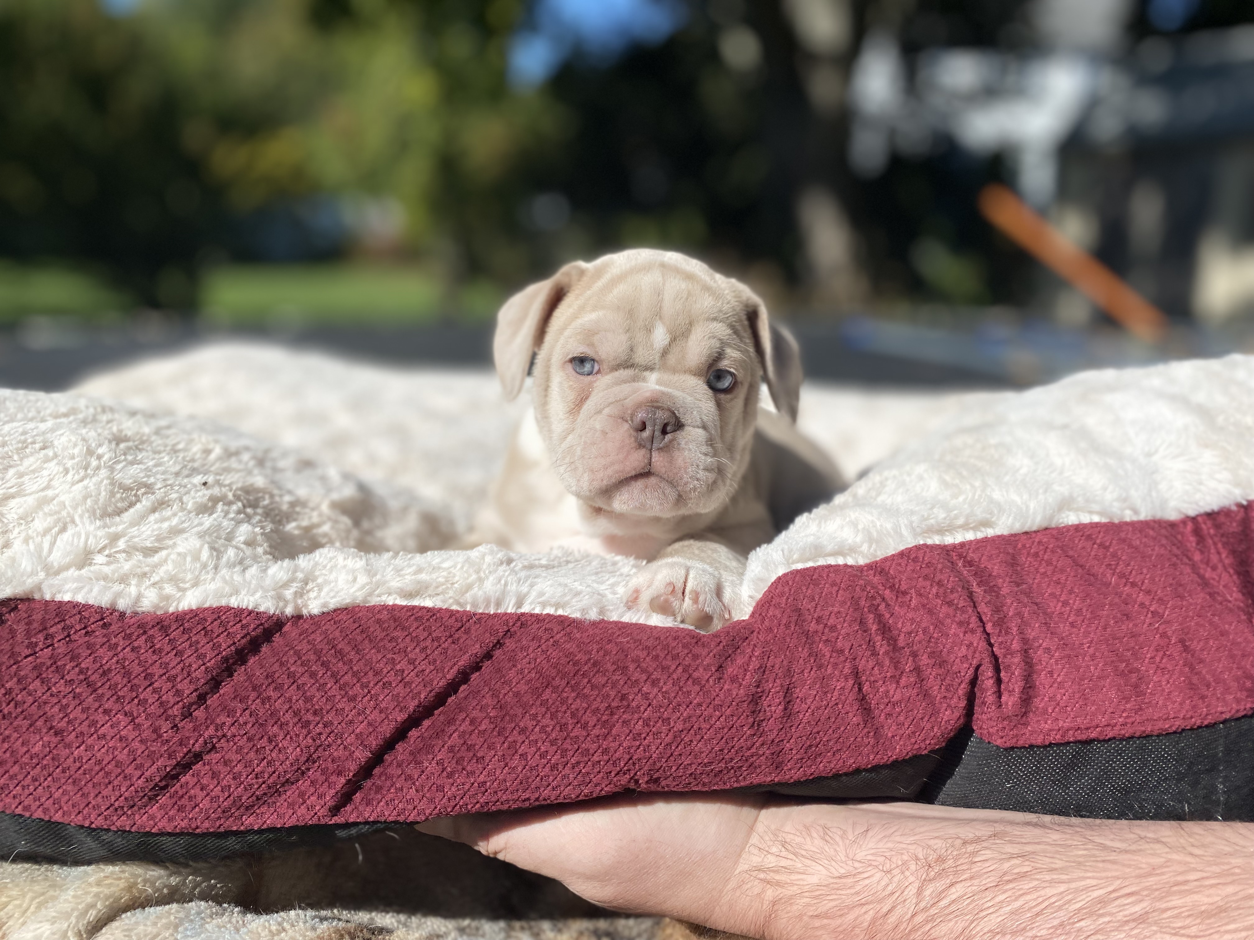 Tan Merle Female, Crystal blue eyes and a Cuddly personality